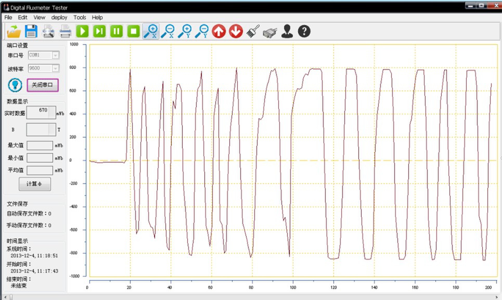 由四川磁通计厂家生产的PEX-2100智能数字磁通计,它的原理是带测量数据处理系统软件,本软件是基于Visual C++ 6.0 设计的一款主要应用于磁感应场测量、计算和分析的上位机软件。该软件具有把下位机上传的数据进行显示、绘图、计算、保存以及打开历史数据等功能,为数字磁通计的使用提供了一款科学并且高效的工具。PEX-2100数字磁通计有USB接口,模拟输出接口。USB接口可以和上位机(电脑)通信,进行测量数据上传;模拟输出接口输出直流电压信号,对直流电压信号可进行二次处理,构成二次仪表。数字磁通计上位机软件具有非常人性化的操作界面,按照界面区域划分,主要包括菜单栏、工具栏、端口设置栏、数据显示栏、文件保存信息栏、时间显示栏、水平/垂直滚动条以及绘图区。各个部分详细功能及使用方法。PEX-2100系列磁通计性能优越,外观设计美观,面板设计简洁合理,可作一般的磁通测量,也可用于产品的大批量检测,操作方便快捷,是测量磁通、磁场的理想仪器。